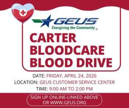 Join us for the GEUS Community Blood Drive and make a lifesaving impact right here in our community. As a special thank-you, donors will receive a quilted tote bag courtesy of Carter BloodCare (while supplies last).