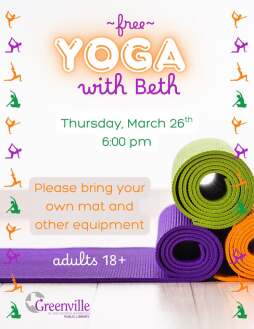 Don’t forget to join us for FREE yoga with Beth next Thursday, March 26th at 6:00 pm! Please bring your own equipment.